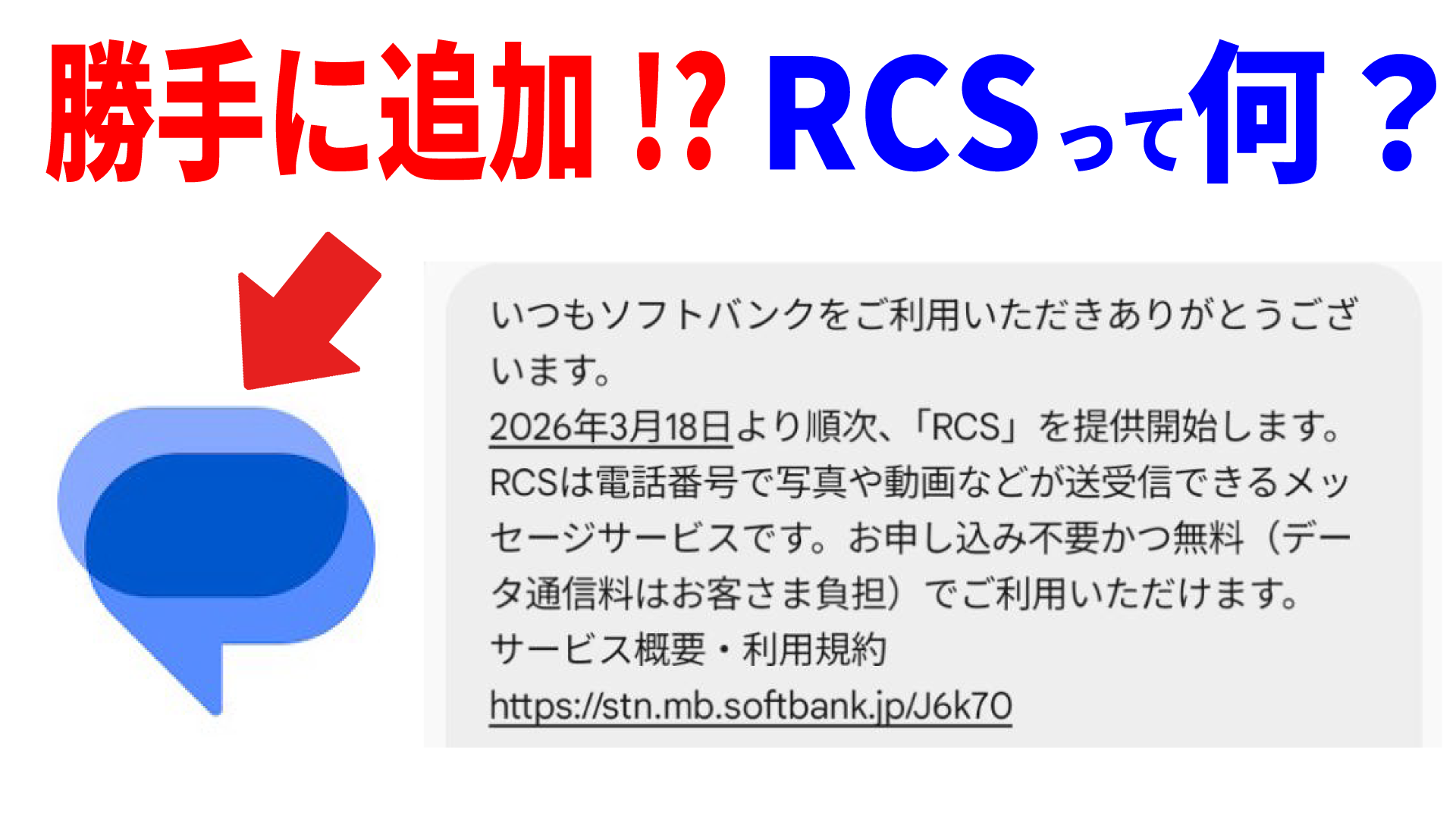 ソフトバンクも、RCSは追加料金なしで使える一方、データ通信定額に未加入の場合は別途ウェブ通信料がかかること、またSMSに自動で切り替わった場合は送信文字数に応じた料金が発生すると案内しています。
