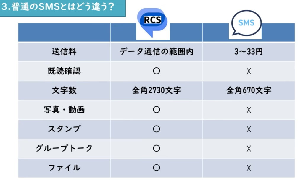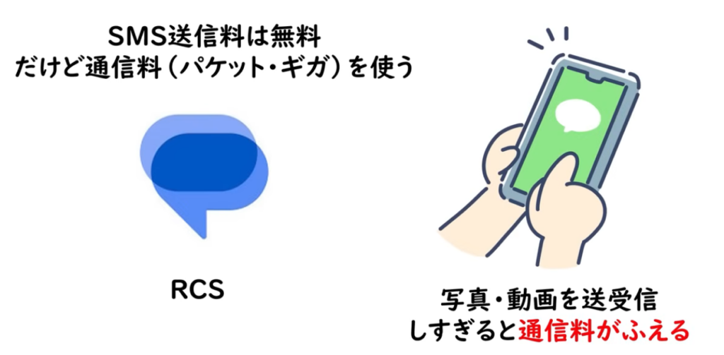 つまり、RCSは基本的にデータ通信を使うため、SMSのように1通ごとの送信料ではなく、通信量の範囲でやり取りする形になります。