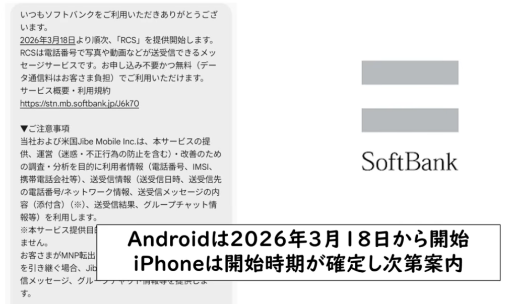 ソフトバンクは、Androidについて2026年3月18日から提供開始と案内しており、iPhoneについては開始時期が確定し次第案内するとしています。ソフトバンク・ワイモバイル・LINEMOの3ブランドで利用できる予定です。