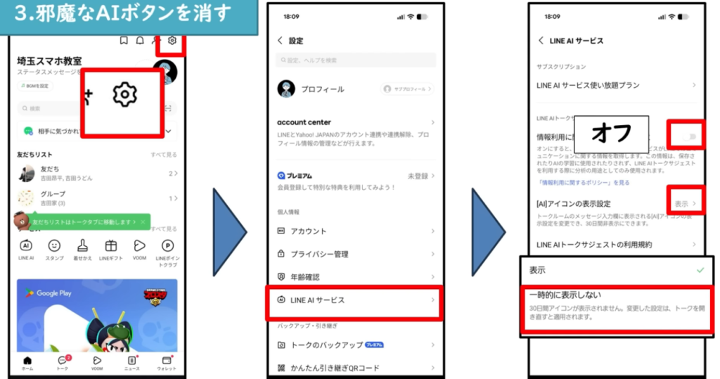 トーク一覧に突然クマの案内が出てきたり、友だちを確認する場所が変わったり、さらにこれまで消せなかったAIボタンが一時的に非表示にできるようになりました。